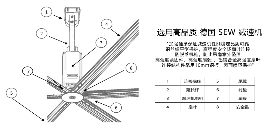 Apogee 減速機(jī)采用德國SEW減速一體機(jī),SKF加強(qiáng)型軸承,進(jìn)口雙油封,低噪音,可靠性高,相比感應(yīng)電機(jī)吊扇,重量減少25KG±,技術(shù)成熟產(chǎn)品,廣受市場好評(píng)。
